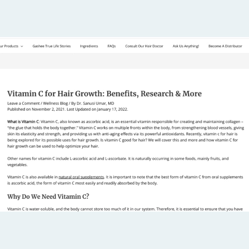 Merujuk kepada artikel yang ditulis oleh Dr Sanusi Omar, Vitamin C adalah mineral yang kaya dengan kolagen. Kolagen merupakan antioksidan yang diperlukan oleh badan kita untuk melancarkan saluran darah di kulit kepala untuk menjadi perumah yang sihat untuk pembentukan folikel rambut dan pertumbuhan rambut yang sihat.