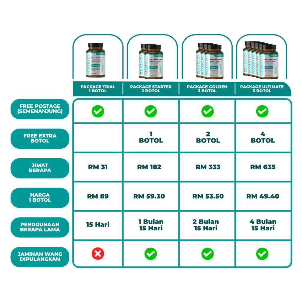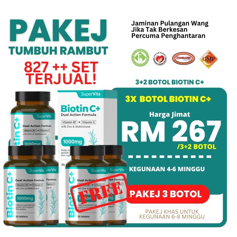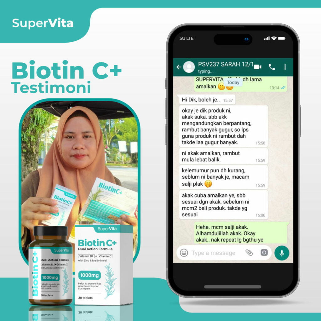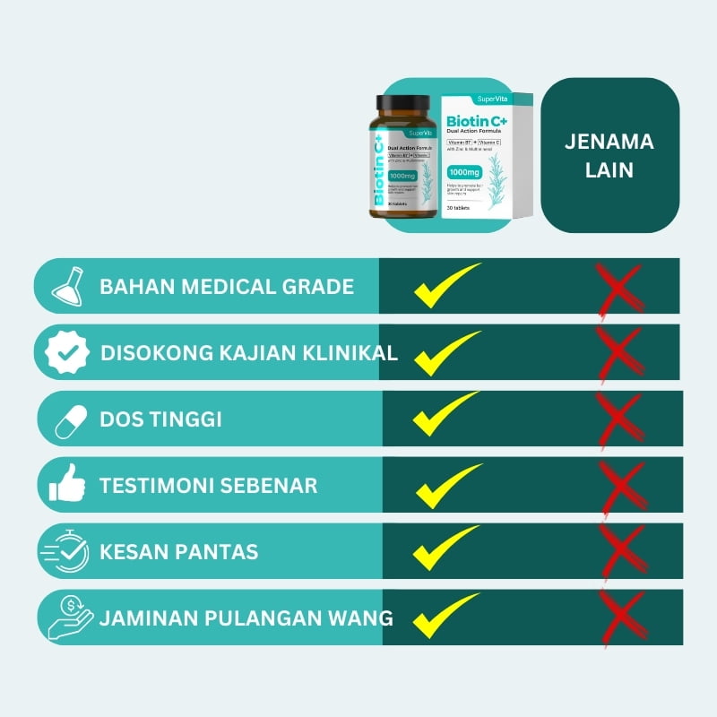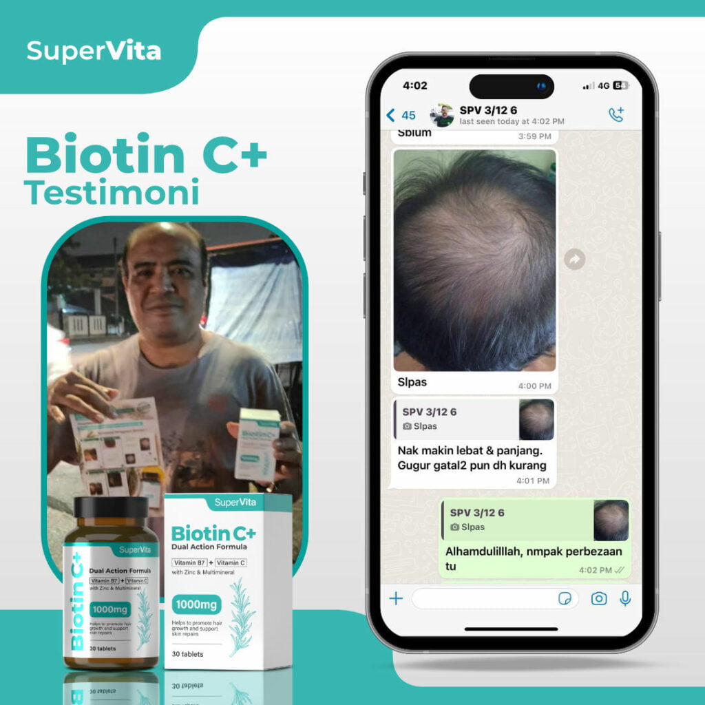 Dengan memberi nutrisi yang diperlukan untuk pembentukan keratin, menyokong kesihatan folikel, dan memperbaiki peredaran darah, biotinC+ membantu rambut untuk tumbuh lebih kuat, lebih sihat, dan lebih tahan terhadap kerosakan.
